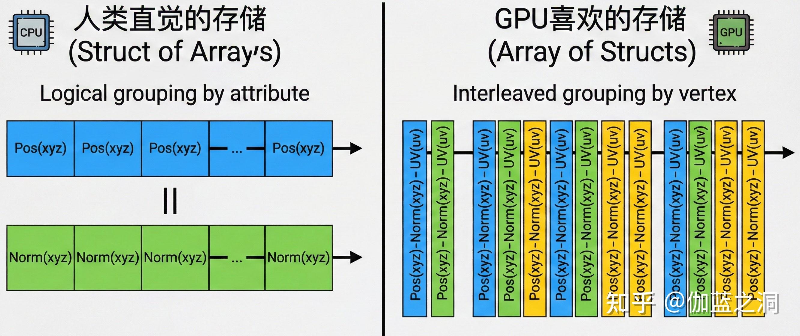 想象一个巨大的数组。引擎将模型拆解,把所有顶点的位置 (Pos)、法线 (Norm)、纹理坐标 (UV) 拍扁。 为了利用 CPU/GPU 的缓存行(Cache Line),现代引擎通常采用交错存储 (Interleaved):